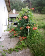 Im Jahr 2005 sah dann alles schon sehr viel besser aus. Unser Garten war schön grün und die Palme hatte sich schon um einiges vergrössert. Trotzdem gab es wieder viel Arbeit (die hört ja an einem Haus nie auf). Wir begannen den Zaun um das Grundstück zu erneuern. Diese Arbeit erschwerte das an einigen Stellen dichte Brombeergestrüpp. Teilweise konnte nur noch ein kleiner Bagger helfen, der die Büsche einfach im roher Gewalt aus der Erde zog. In diesem Sommer ersetzten wir insgesamt 60 m Zaun, brachten dafür 29 Pfähle an, verbrauchten 200 m Draht und hatten schmerzende Hände. Aber dank der Hilfe meines Vaters war auch dies geschafft: die Hälfte des Zaunes um das Grundstück war ersetzt. Die Mauern im Grundstück malten wir weiss und so war endlich alles ein bisschen aufgefrischt. Wir kauften noch einen schönen Tisch mit zwei Bänken aus Stein für den Garten, bauten darüber eine Laube, die mal mit Wein bewachsen sein soll. Nach hinten heraus bauten wir einen Anbau, der ein Arbeitszimmer und ein zweites Badezimmer beherbergen sollte. Das Arbeitszimmer wurde noch fertiggestellt, das Bad blieb erstmal im Rohbau, aber mit Anschluss für die Waschmaschine, die bis dahin noch bei unserem alten Haus stand (darum musste man zum Wäschewaschen immer das Auto benutzen.....).