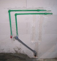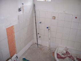 Da wir uns nun für einen anderen Waschtisch entschieden hatten mussten zunächst die Wasserleitungen verlegt werden, bevor mit dem Verfliesen begonnen werden konnte. Laut der Planung wurden auch die farbigen Fliesen und die Dekore verlegt und dann alles in weiss verfugt, fertig war die “Hülle” des neuen Bades.