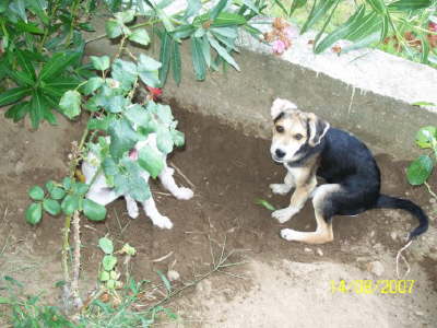 Die Lieblingsbeschäftigung der verbliebenen sechs Welpen war es Löcher in alle Beete zu graben. (Viktoria und versteckt hinter der Rose: Knut)