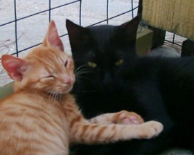 Im Jahr 2002 kam ein winziges schwarzes Ding in unser Haus: eine zweite Katze. Sie war wohl gerade erst mehrere Wochen alt und musste noch einige Zeit mit der Flasche gefüttert werden. Der Dicke wurde Ersatzmutter, er reinigte die Kleine, die in ihrem Pass eigentlich Platitera heisst. Die Kleine schläft gerne unter allen Decken in unserem Bett.