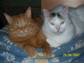 In der Umgebung unseres neuen Hauses gab und gibt es natürlich viele Katzen, aber keine war bis jetzt so dreist wie unser Charisteas. Wir dachten erst es wäre eine grosse Ratte, die regelmässig aus der Hundeschale auf der Terrasse frass. Aber bei Licht betrachtet war es ein kleiner rot getigerter Kater. Ich kraulte ihn ein wenig und er entschloss sich ab dann im Haus zu wohnen. Er war so klein, dass er sich durch den Zaun unseres Katzenauslaufs quetschte und durch die Katzenklappe in der Küche erschien, pünktlich zur Fütterungszeit. So schnell wie wir ihn aus der Vo rdertür raussetzten, so schnell war er durch den Zaun wieder im Haus. Also gaben wir nach und seitdem (2004) wohnt dieser Kater ebenfalls im Haus. Inzwischen ist er aber um einiges gewachsen und erinnert an Garfield. Am liebsten trinkt er direkt aus dem Wasserhahn, maunzt morgens um fünf Uhr und apportiert seine Maus gerne stundenlang, wenn wir sie werfen. Damit war unser Katzentrio vollständig, mehr Katzen kann unser Haus sicher nicht verkraften, denn diese drei haben schon alle möglichen Plätze mit Beschlag belegt.